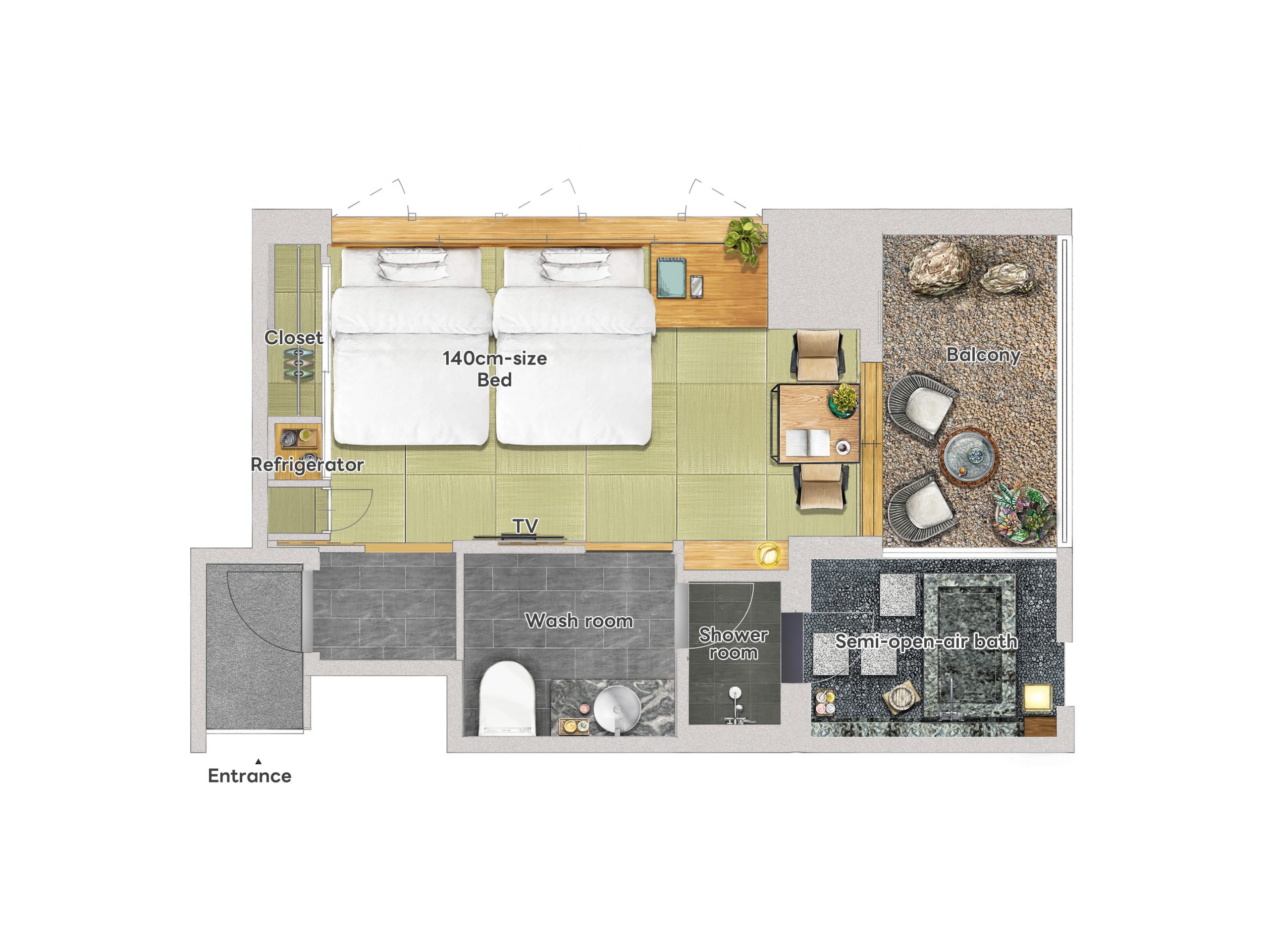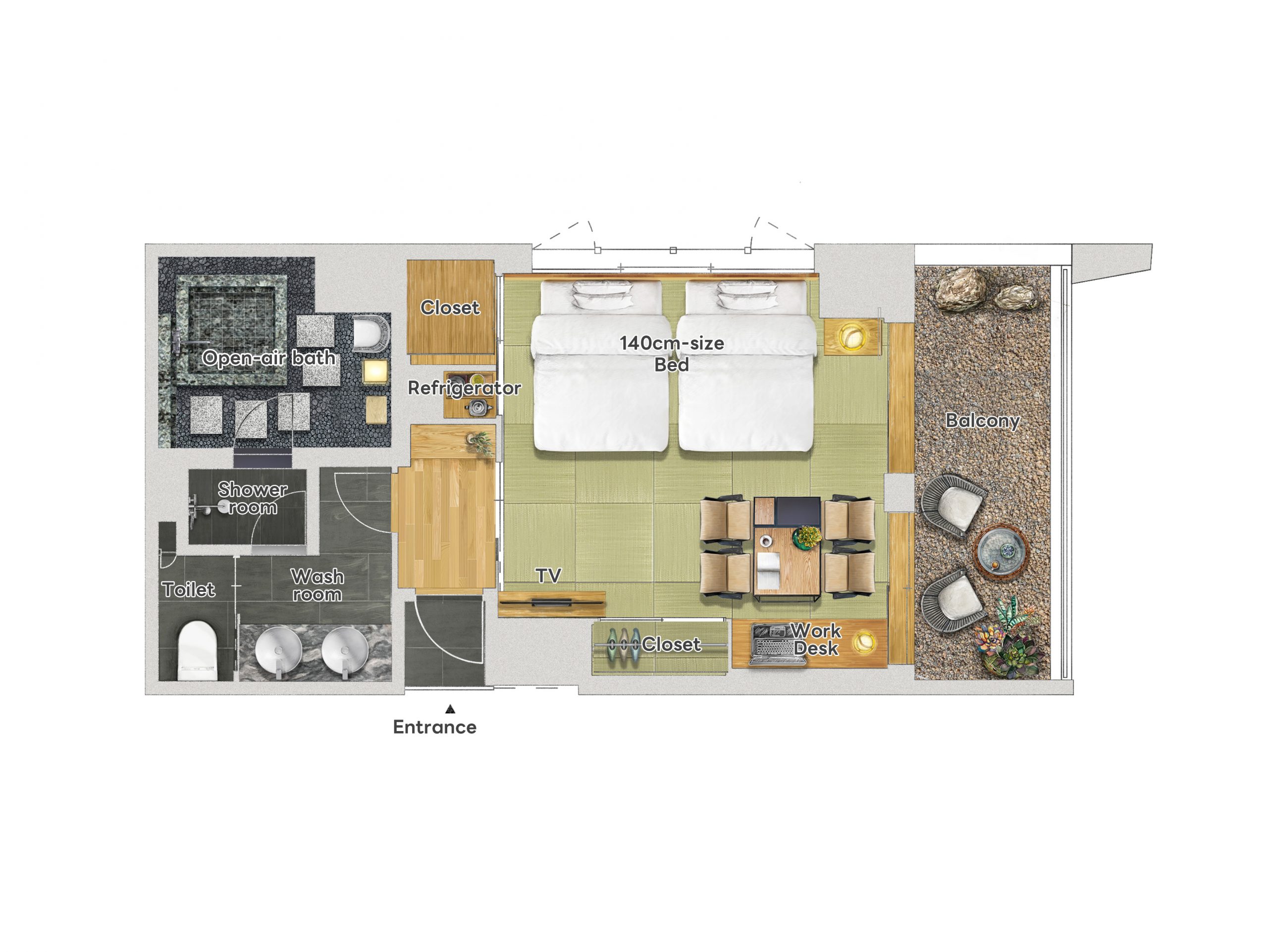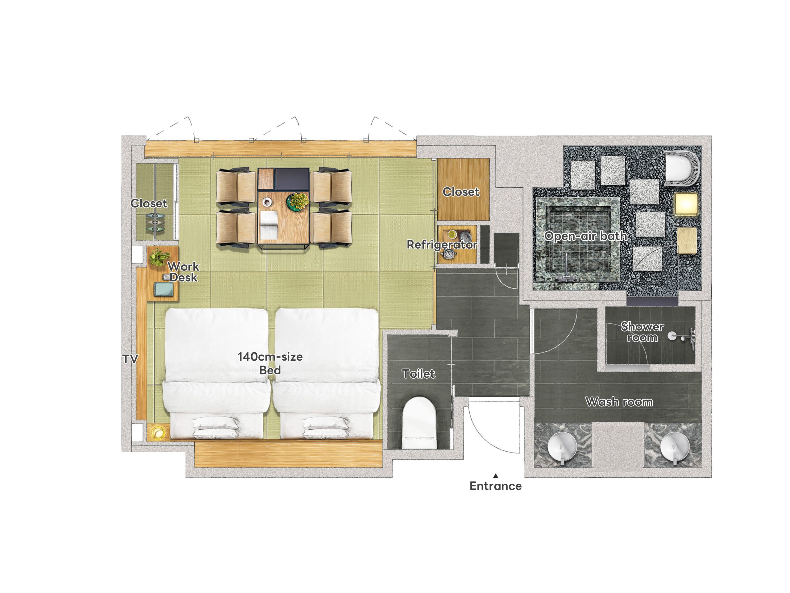 6タイプの客室は、全室畳を敷いた和の空間に仕上げました。 洋室では味わえない「旅先の我が家」としてのくつろぎをご堪能ください。