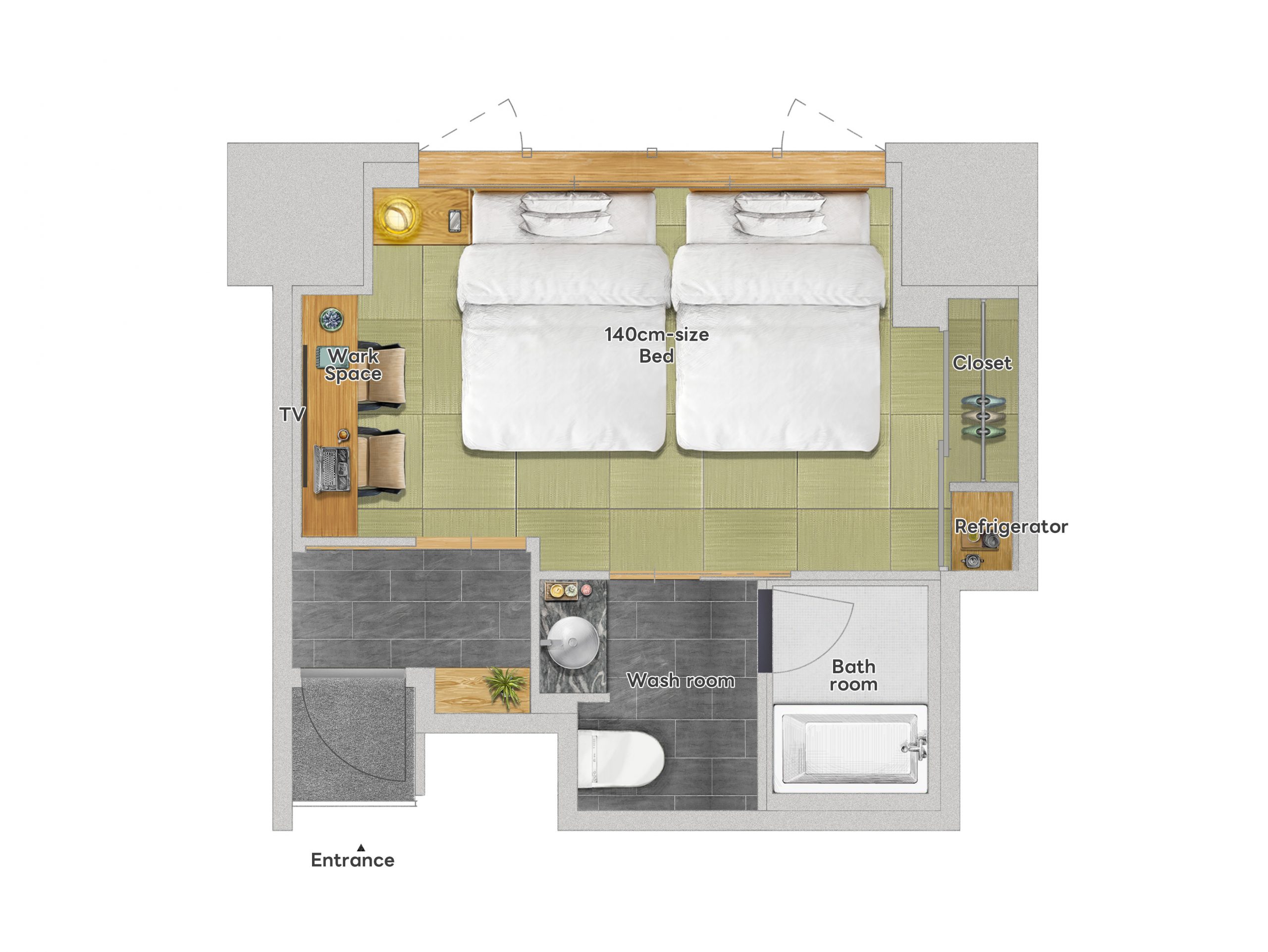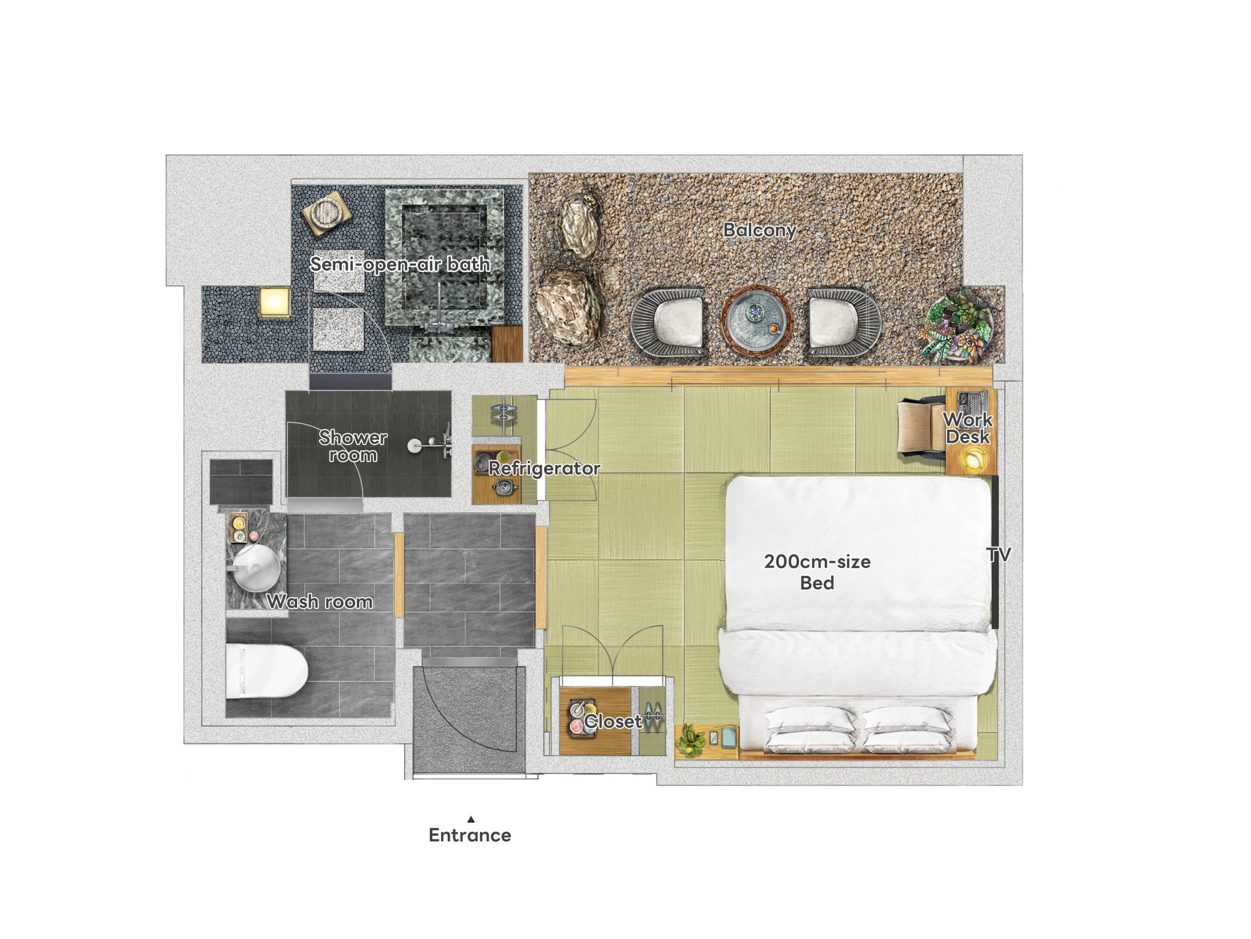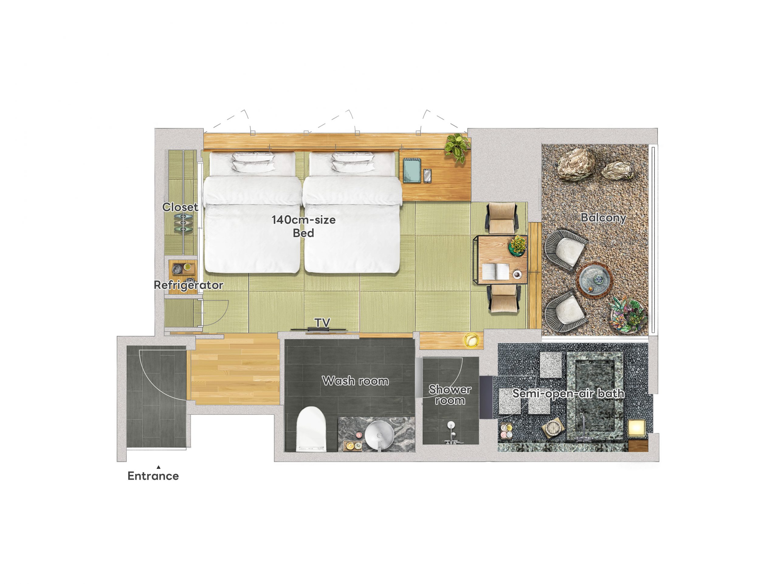 6タイプの客室は、全室畳を敷いた和の空間に仕上げました。 洋室では味わえない「旅先の我が家」としてのくつろぎをご堪能ください。
