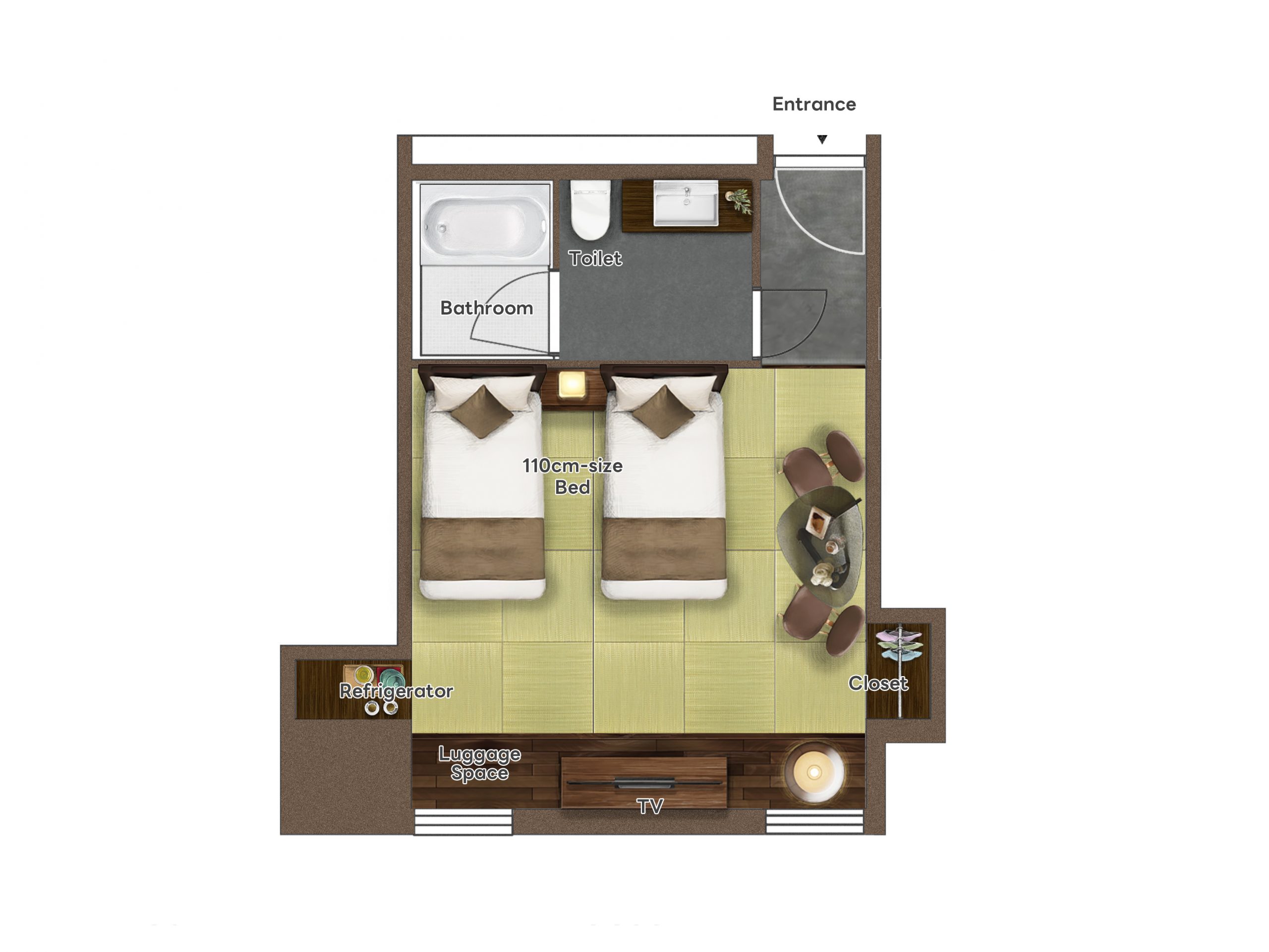 | Floor | 10F | Beds | 2 single beds (Width 110cm). An extra futon is available for three-person groups. |